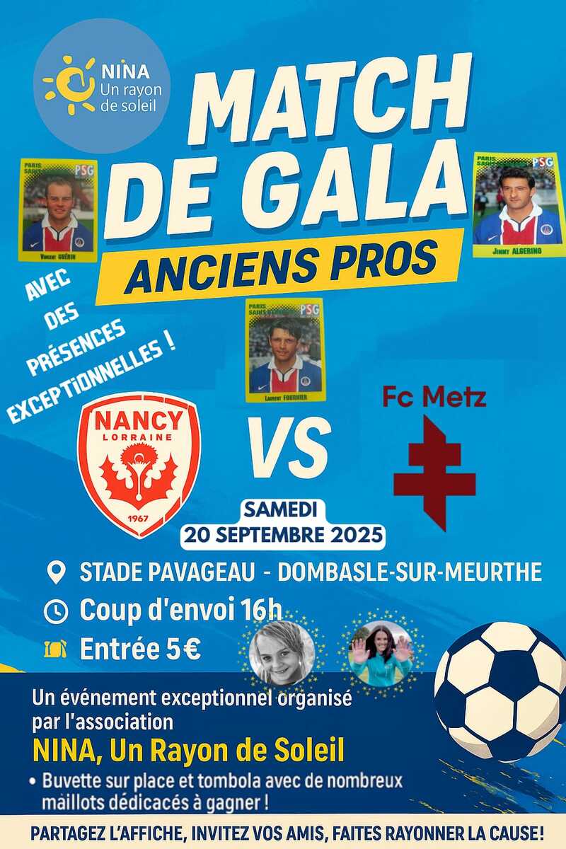 ✠Un match de gala rĂ©unira les anciens professionnels de lâAS Nancy Lorraine et du FC Metz, avec la prĂ©sence de grands noms du football :